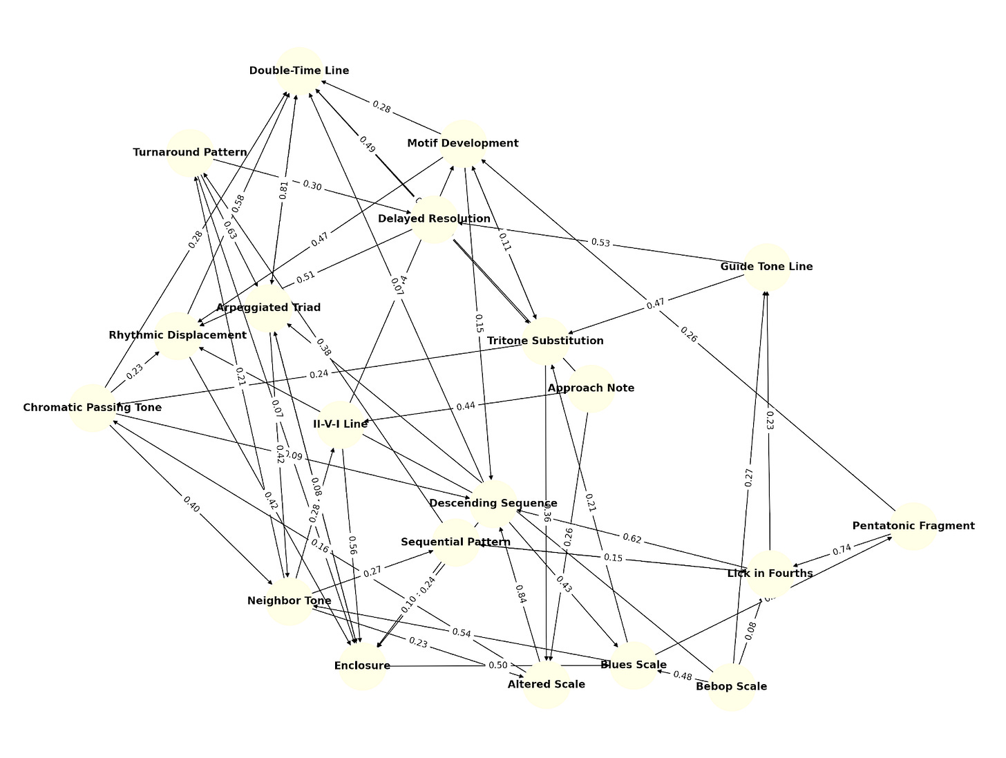 Figure 3: An example of a Markov chain with transition probabilities between different jazz riffs describing a black-box jazz pianist that chooses things to play at random that sound “locally” good, but weird to listen to in context. Riff/lick names auto-generated by ChatGPT-4o — I’m trying to make a point, not suggest a real generative model of a jazz solo.